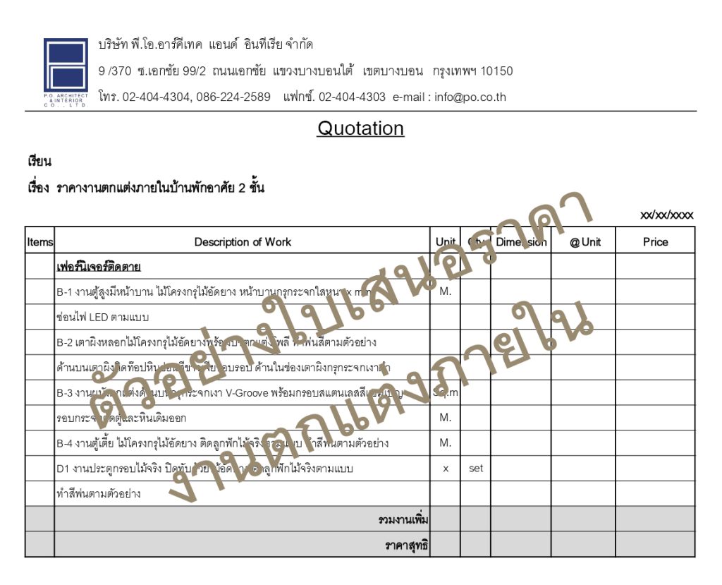 การออกแบบตกแต่งภายในไม่ใช่เพียงการเลือกเฟอร์นิเจอร์หรือวัสดุให้สวยงามเท่านั้น แต่ยังเป็นกระบวนการที่ต้องอาศัยการออกแบบตั้งแต่แรกเริ่ม รวมทั้งการวางแผนและการประเมินราคาอย่างละเอียด ต้องให้ผู้มีประสบการณ์ในการทำงาน เพื่อให้เจ้าของบ้านสามารถควบคุมงบประมาณได้อย่างเหมาะสม บริษัท พี.โอ. อาร์คีเทค แอนด์ อินทีเรีย จำกัด จึงให้ความสำคัญกับกระบวนการตั้งแต่เริ่มต้นไปจนจบโครงการ ตั้งแต่ช่วงเริ่มต้นของงานออกแบบ ไปจนถึงการก่อสร้างจริงเพื่อให้หน้างานจริงกับราคาที่นำเสนอมีความแม่นยำและใกล้เคียงกับงบประมาณจริงมากที่สุด
